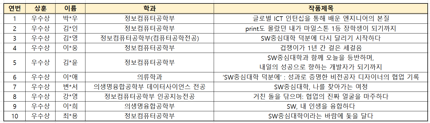이번 공모전에는 학생 여러분의 창의적이고 진솔한 작품이 많이 접수되었으며, 심사위원들은 SW중심대학에서 느낀 배움과 성장, 도전을 담은 이야기들을 높이 평가했습니다.