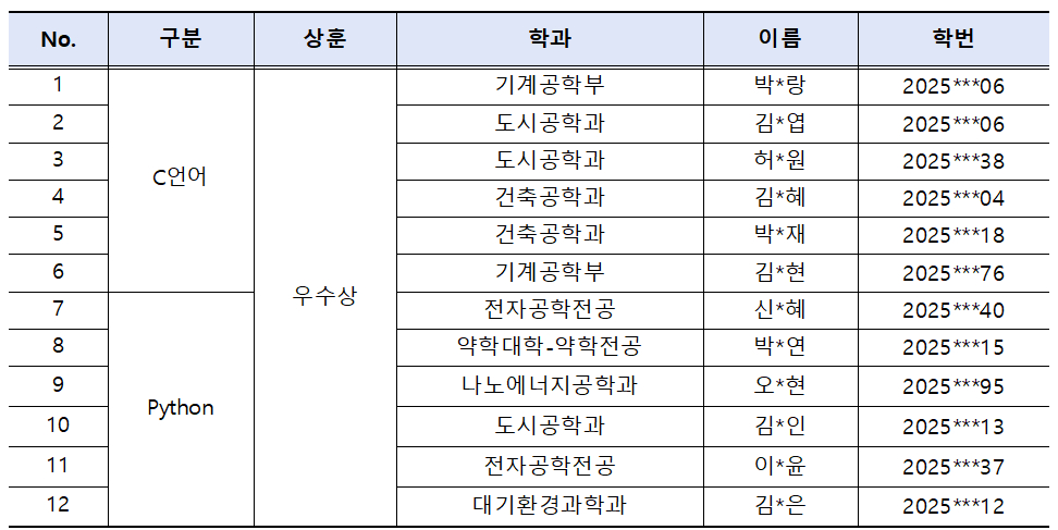 소프트웨어융합교육원에서는 ‘교양필수 컴퓨터 교과목’을 수강하는 학생들을 대상으로 코딩존 운영 및 멘토 프로그램을 통해 교과목에 대한 이해도를 높이고 학생들의 코딩 역량을 강화할 수 있도록 지원하고 있습니다. 이를 기반으로 학생들의 코딩존 참여 확대 및 SW 학습에 대한 동기를 부여하고자 다음과 같이 코딩역량강화 프로그램을 운영하였으며, 그 결과 총 12명의 수상자가 선정되었습니다.